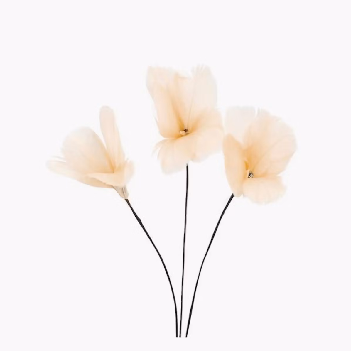 Fjädrar med ståltråd, formade som blommor. Perfekta för att dekorera grenar eller blomsterarrangemang. Finns i flera färger.