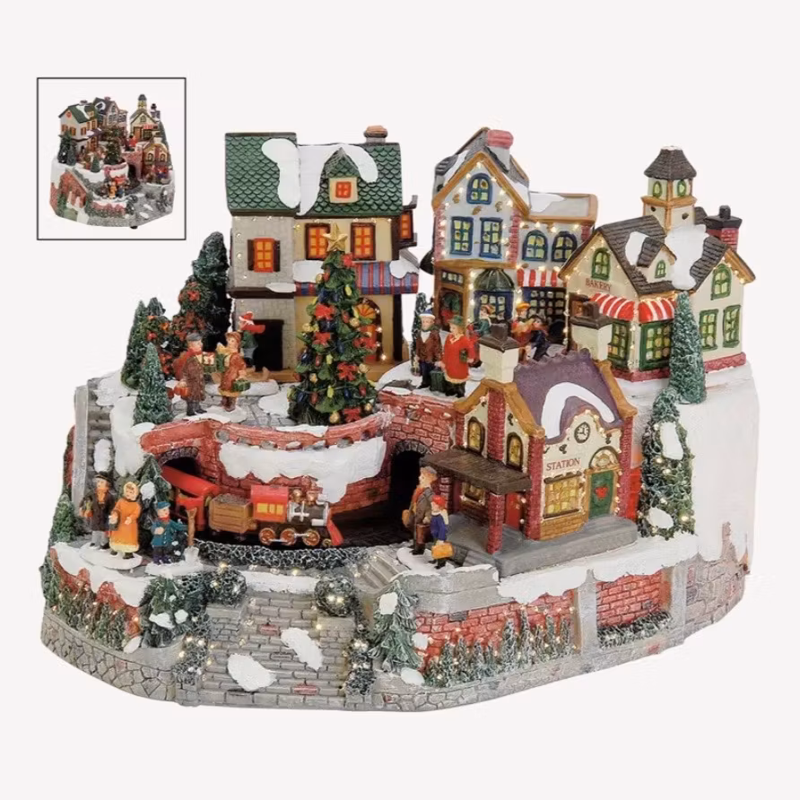 Vinterby med många fina detaljer. Här finns ljus i husen, gatubelysning och et tåg som kör runt. El drivet
