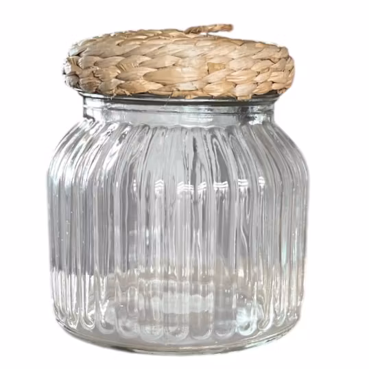 Förvaringsglas med riller och lock dekorerat med flätad vass. Godkänd för bevaring av mat