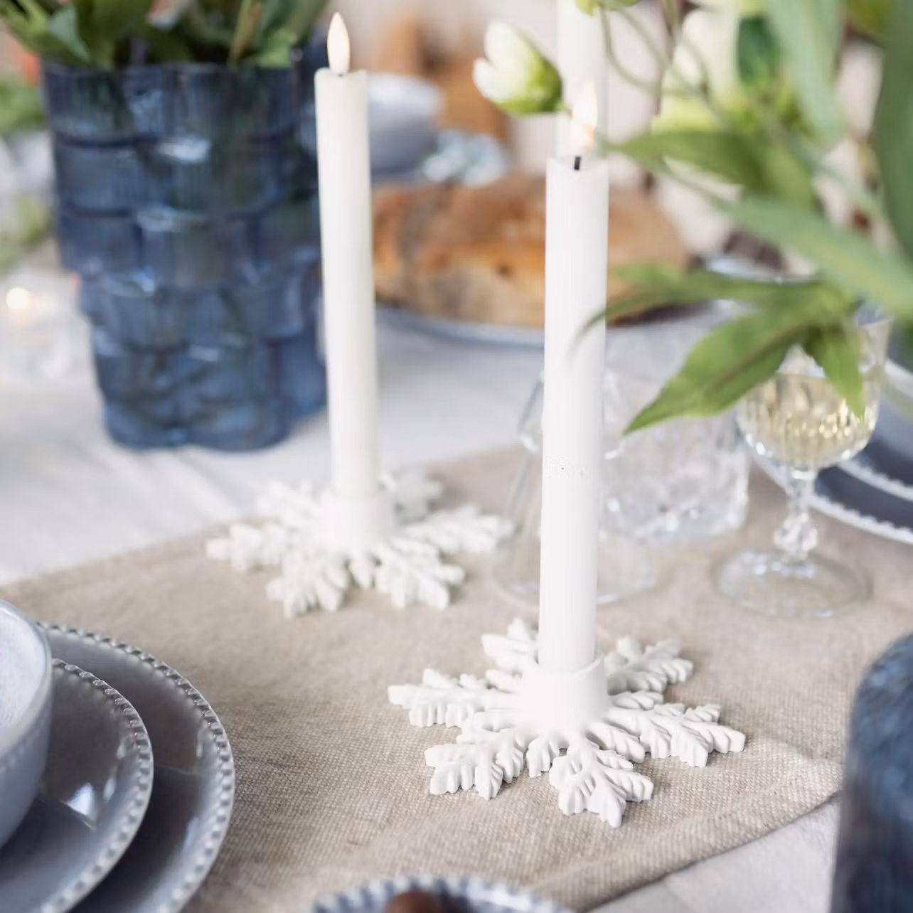 Ljusstake i formen av en snöflinga. Ett charmigt sätt att presentera levande ljus under vintern.