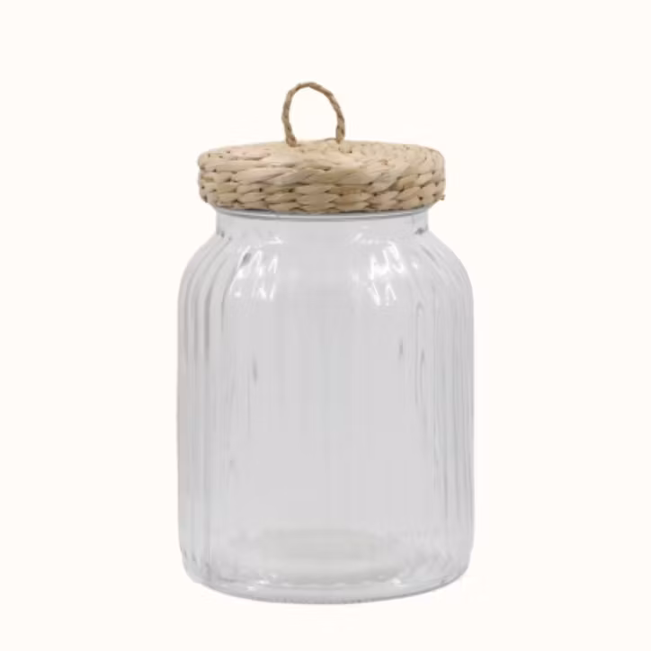 Förvaringsburk med riller och lock dekorerad med vass. Godkänt för livsmedel