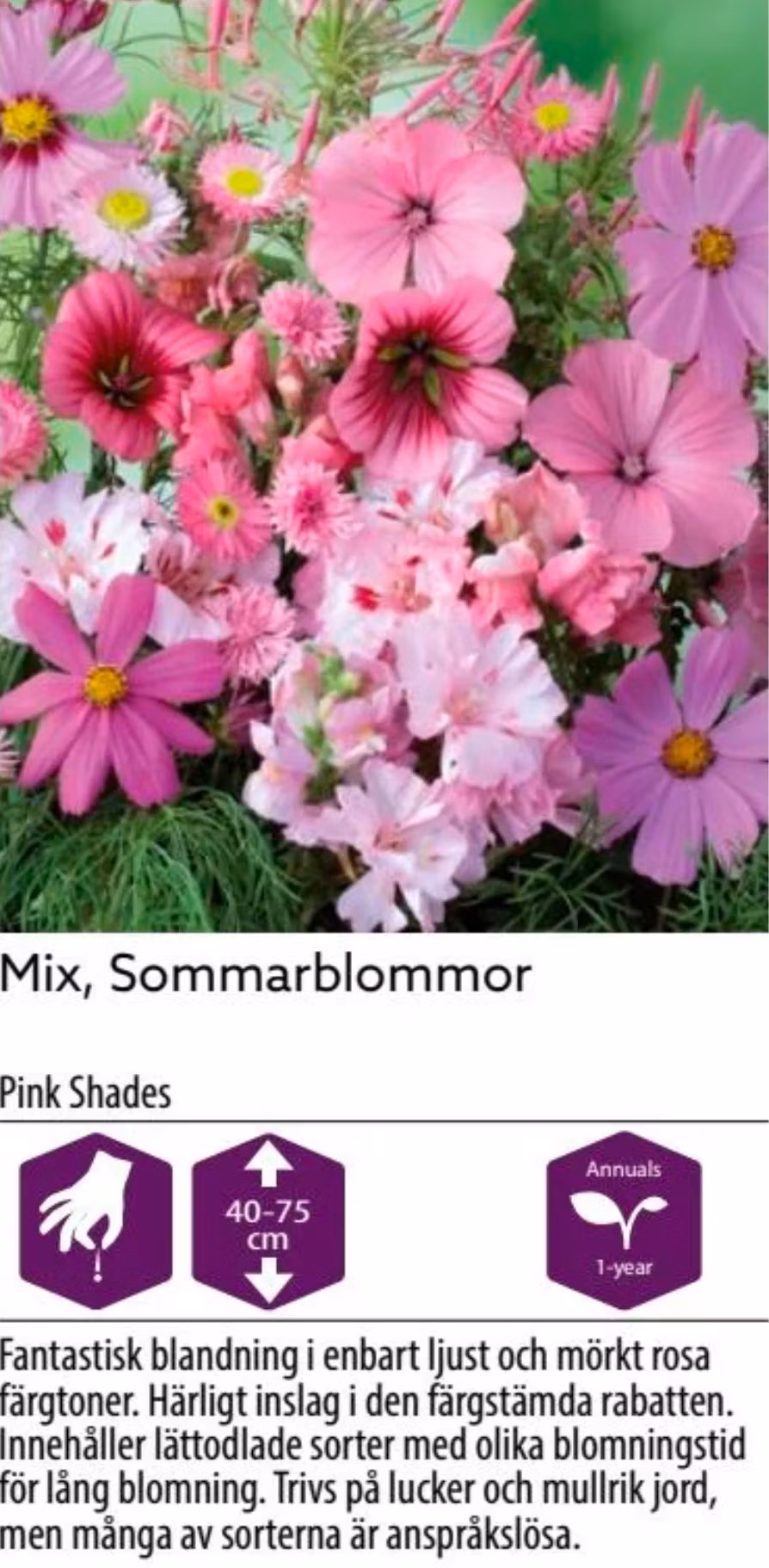 Sommarblommor mix Rosa 42 kr 32 kr Produkten är tyvärr slut i lager, men kan förbeställas Sommarblommor mix rosa. Kan direkt sås Nelson Garden Flera populära produkter Klockmalva Nelson Garden Slutsåld Stockros Charters Dubbel Nelson Garden Slutsåld Ringblomma Pacific Beauty Nelson Garden Slutsåld Rosenskära Purity Slutsåld Rosenskära Fizzy Pink Dark Center Slutsåld Prydnadspumpa Crowns of Thorns Slutsåld