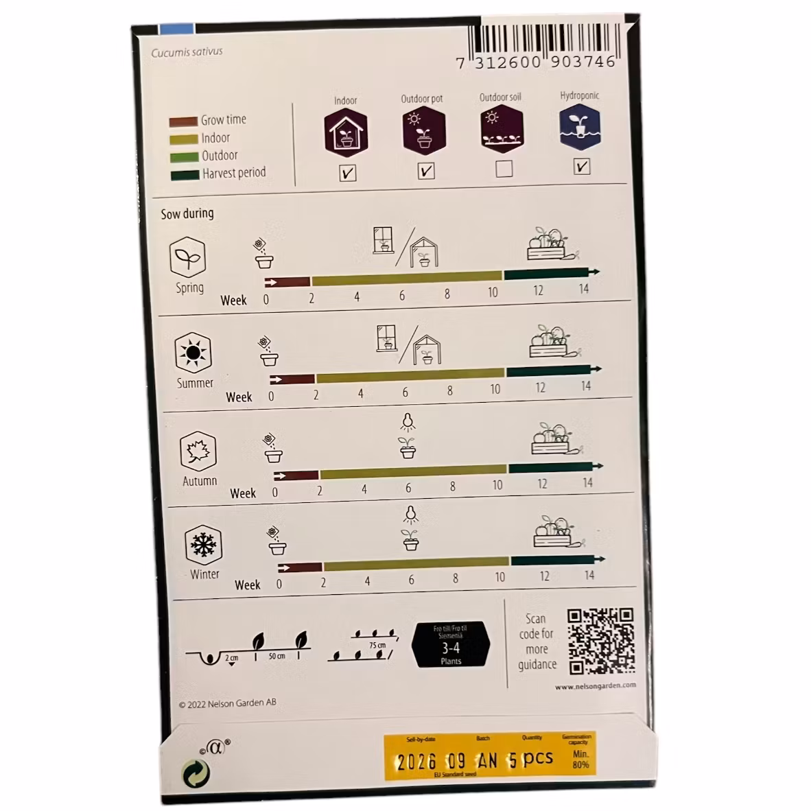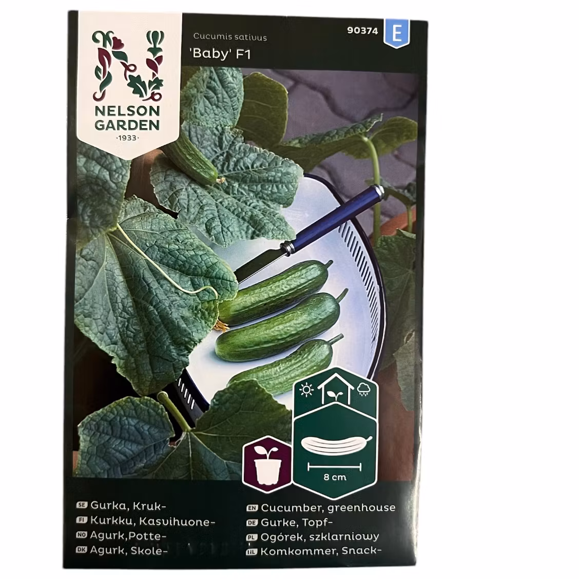 Smakrik, krispig minigurka med slätt skal, perfekt att odla i växthus, i stor kruka i skyddat läge eller som "gurkgardin" inne. Bind upp plantan. Toppa vid lagom höjd. Behöver ej pollineras. Skörda ofta, låt inte gurkorna bli för stora.