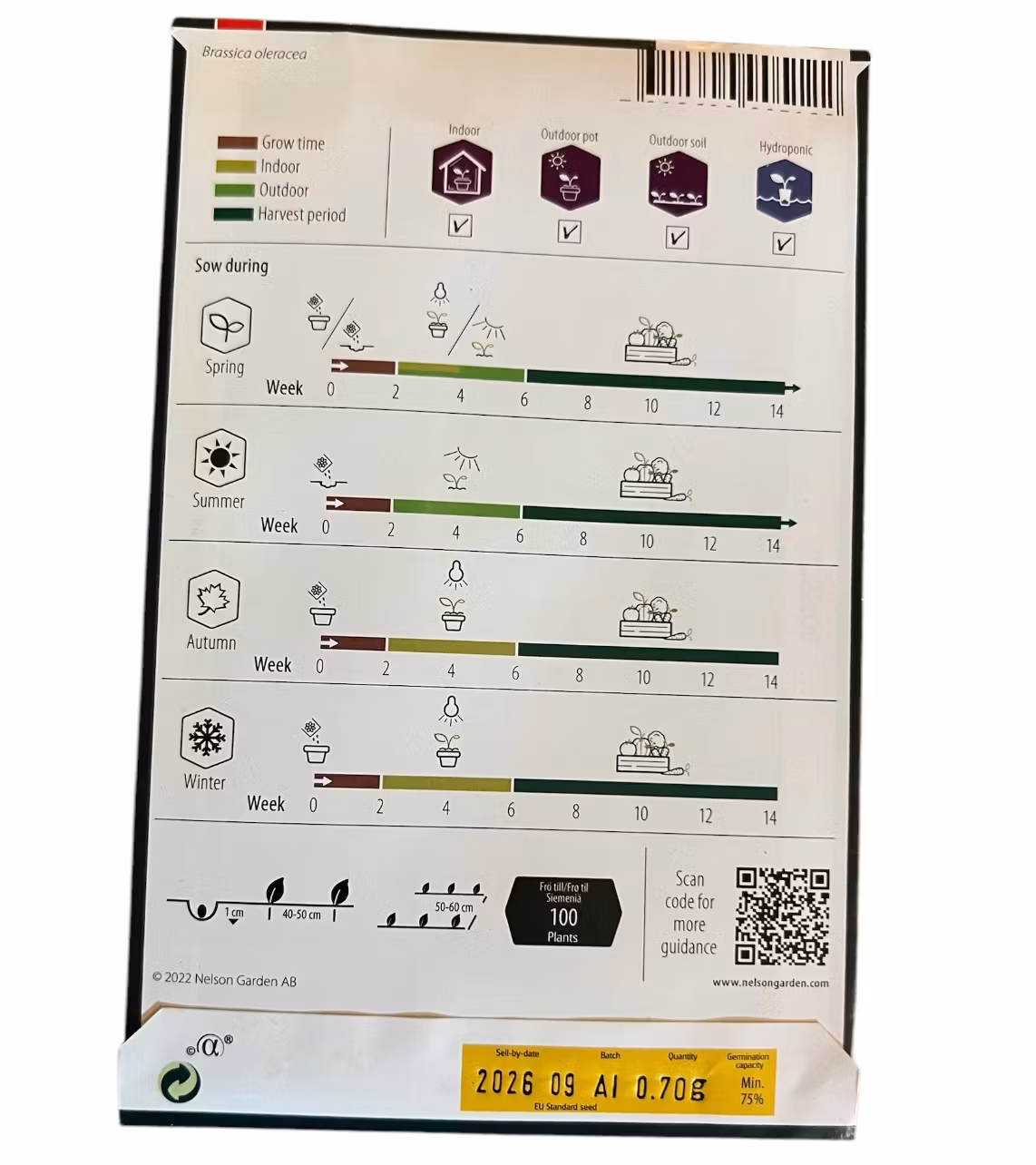 Vintersådd (sv) | Så i växthus eller inomhus för att skörda småblad under tidig vår. Vid sådd inomhus behövs växtbelysning. Går också bra att kallså, görs med fördel i kruka. Gror då på våren. Nelson Garden |