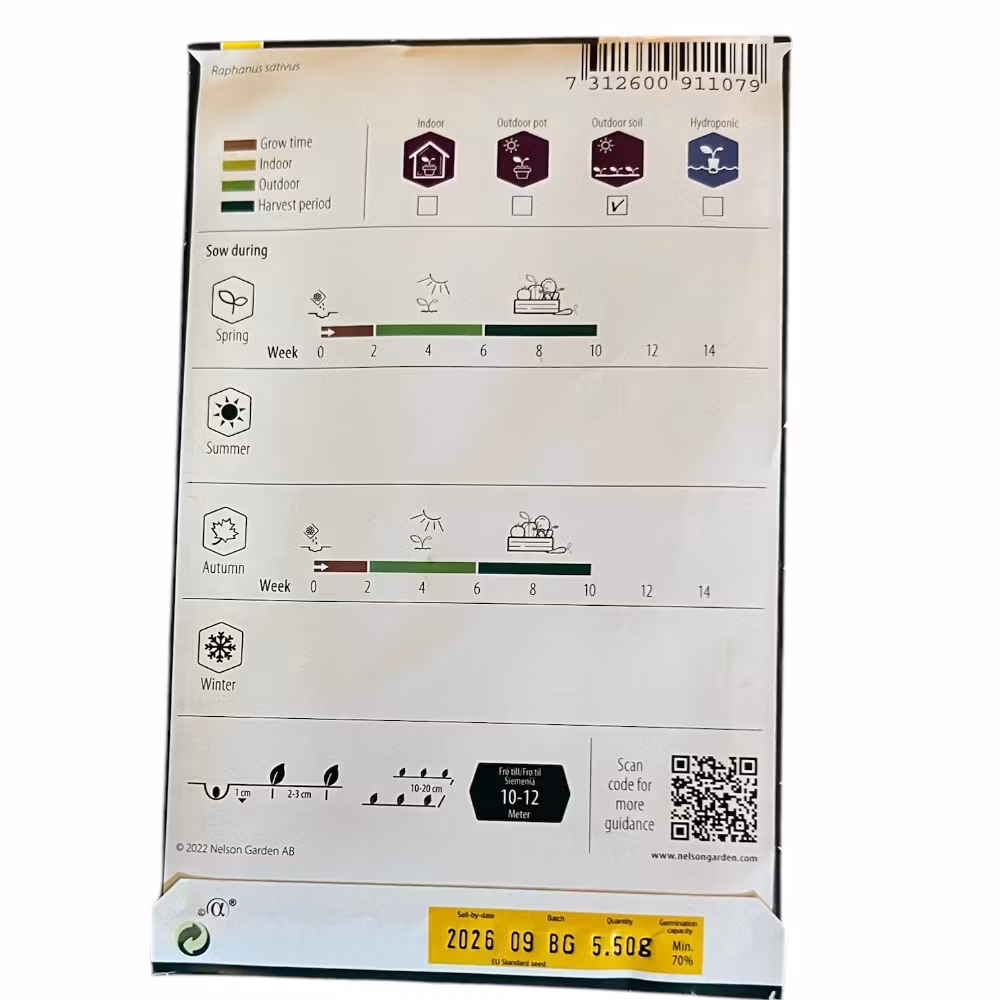 Direktsådd: Tidigt, så snart jorden går att bruka-aug. Vattna i såfåran innan sådd. Viktigt att hålla sådden fuktig. Sallatsfrön gror ej vid temp. över +20°C.