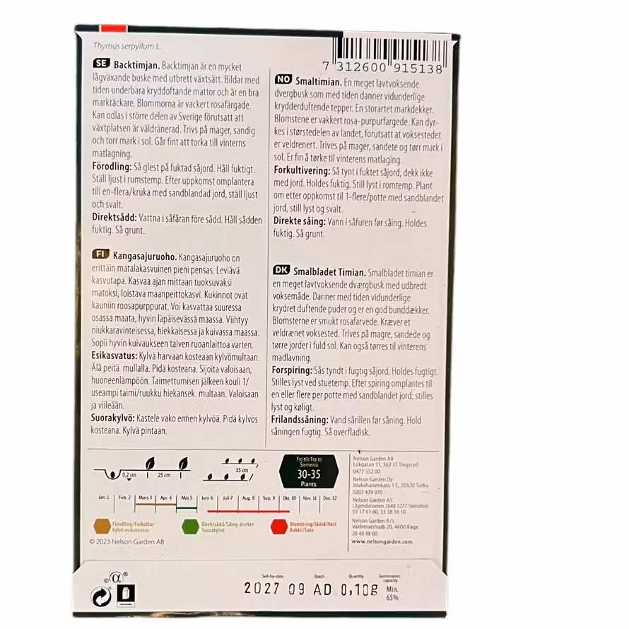 Timjan Back 42 kr 32 kr Produkten är tyvärr slut i lager, men kan förbeställas Backtimjan flerårig som kan bilda stora tuvorNelson Garden Flera populära produkter Grönkål Half Tall Slutsåld Vintersallat Verte de Cambrai Slutsåld Tomat Hög Golden Currant Organic Slutsåld Tomat Hög Bronzy Slutsåld Spenat Vroeg Reuzenblad Organic Slutsåld Malabar-spenat Röd Slutsåld