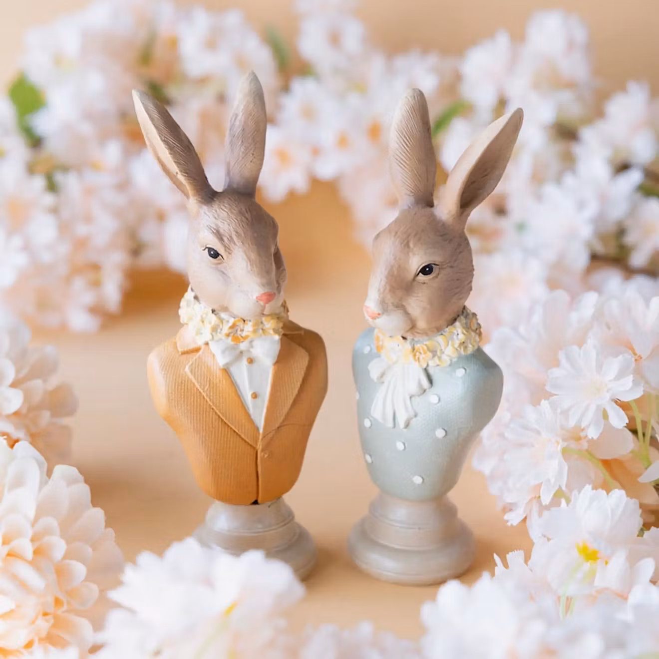 Två byster med välklädda kaniner. En rolig dekoration för hemmet som också passar till påsk. Säljs i 2pk